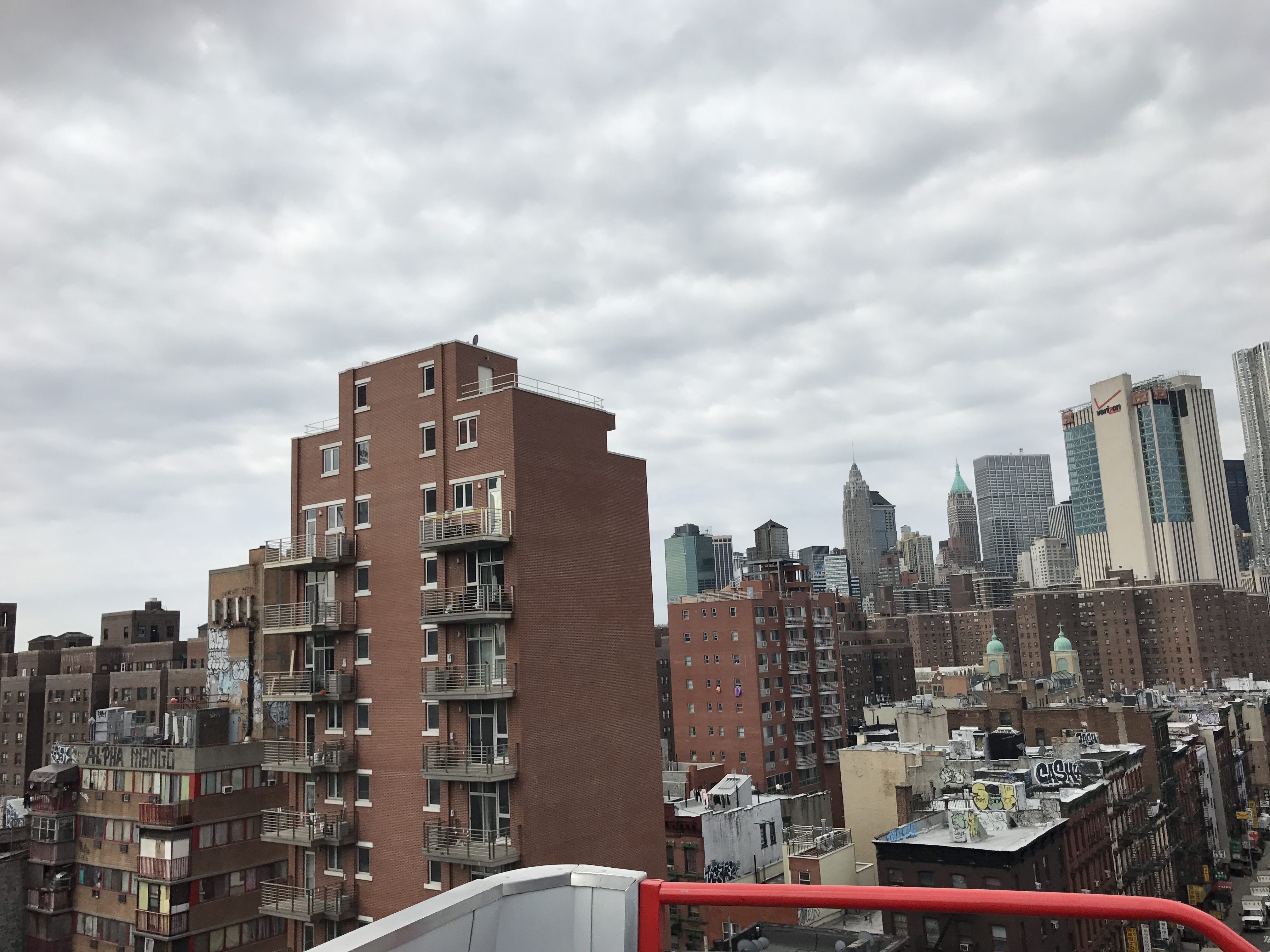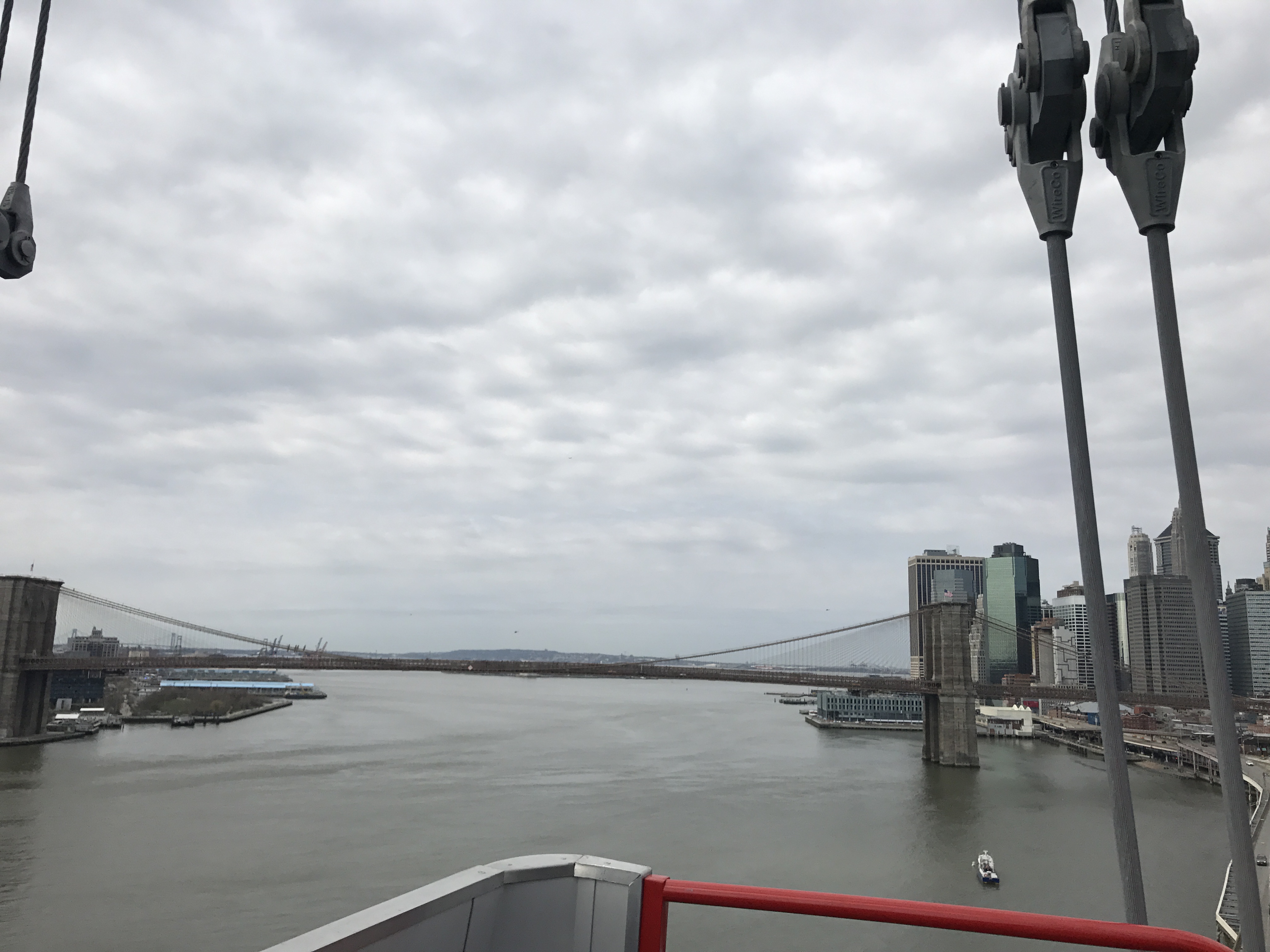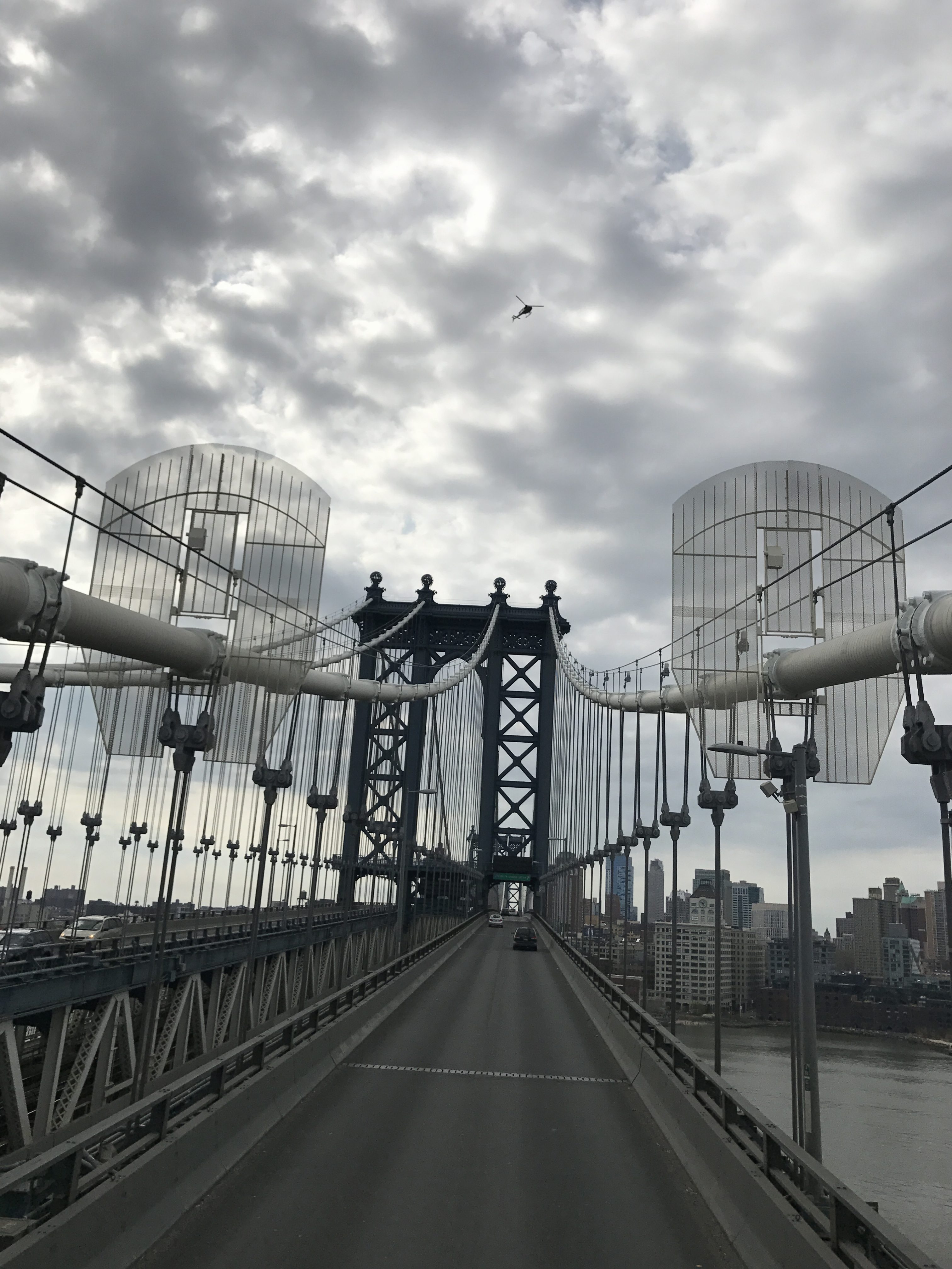 Manhattan Bridge i wyraźnie widoczne „ogrodzenia z bramami” broniące dostępu do lin i szczytów pylonów. Ochrona przed samobójcami